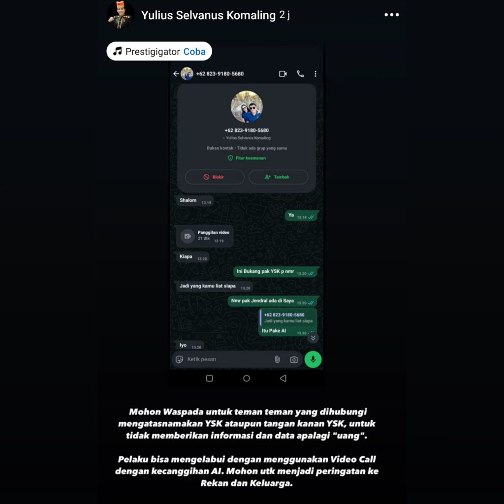 “Ini adalah pemanfaatan teknologi AI yang sangat canggih. Harap ini menjadi peringatan bagi semua rekan dan keluarga untuk selalu waspada,” tegas YSK, mengingatkan masyarakat agar tidak mudah tertipu. (gobs)