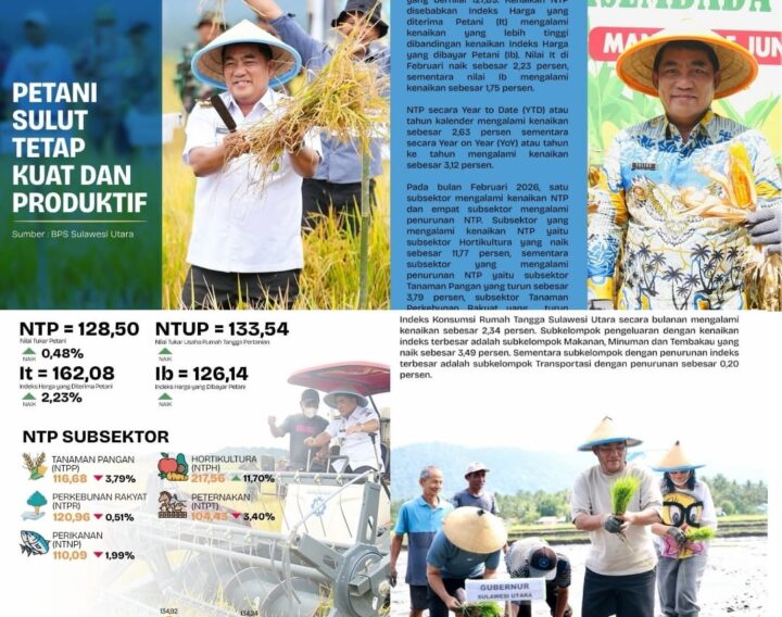 Data terbaru dari Badan Pusat Statistik (BPS) mencatat Nilai Tukar Petani (NTP) Sulut pada Februari 2026 naik menjadi 128,50, menandakan petani berada dalam kondisi menguntungkan.